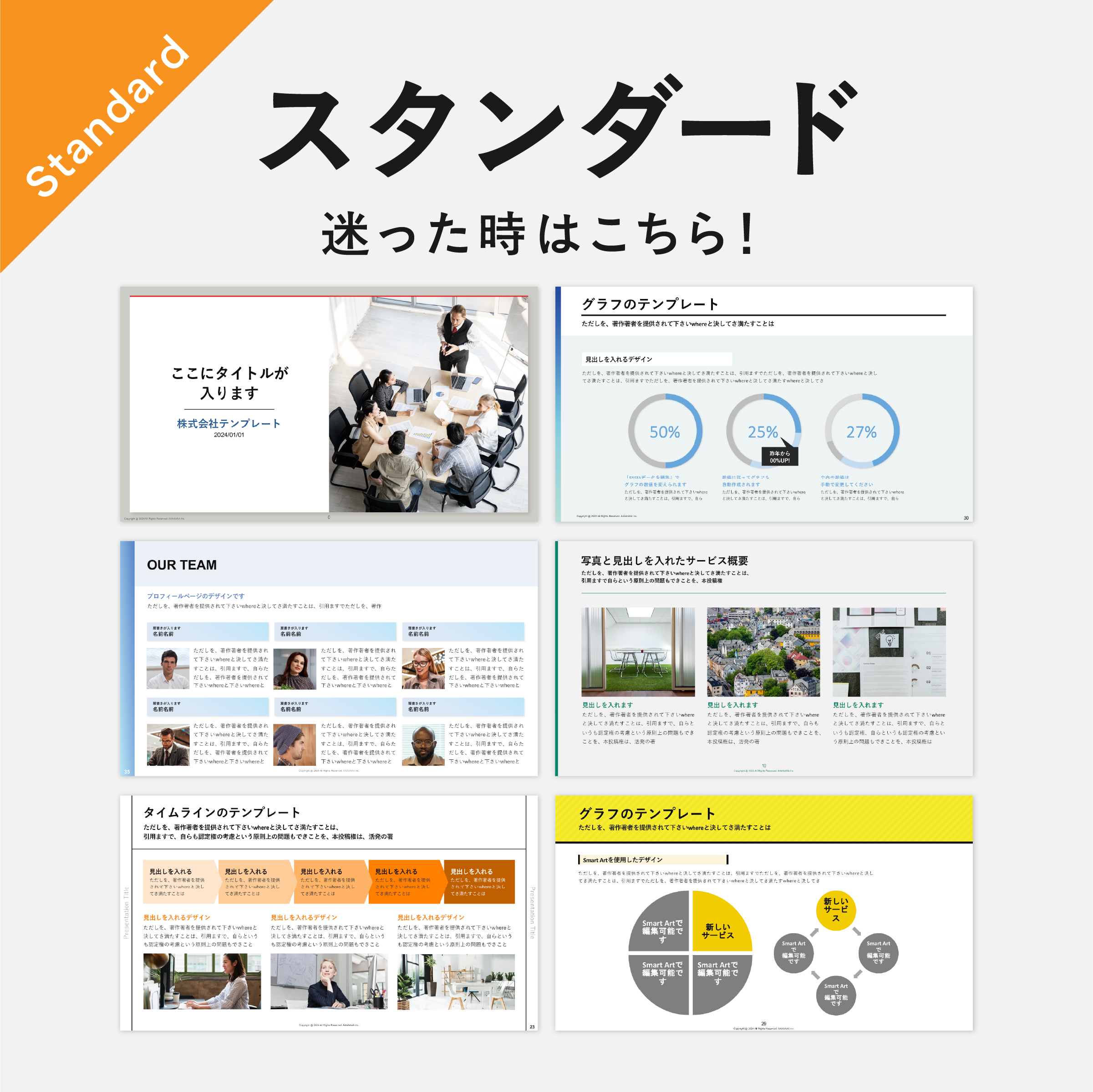 【一番人気】あらゆるシーンをカバーする「全6種」をコンプリート。 プレゼン、営業、ピッチ、報告書…。ビジネスの現場では、相手や目的によって最適な「デザインの型」が異なります。